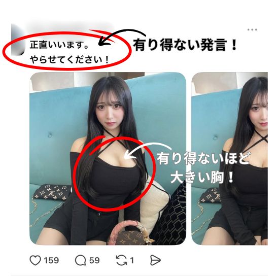 釣り垢アカウントの女性は、異常に胸が大きく、AIによって画像作成されている可能性が極めて高いです。